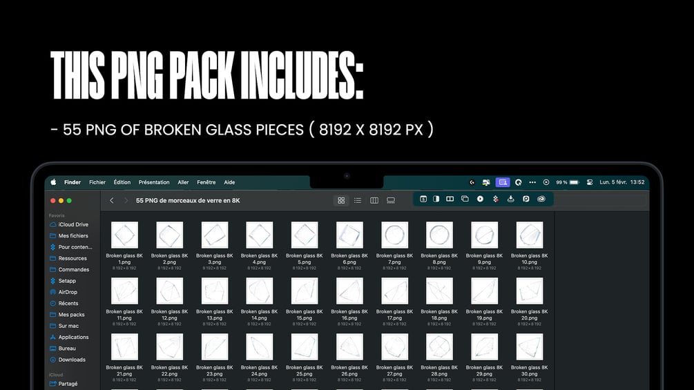 🇺🇸🏴 Hey! I've prepared an ultra-useful pack for you with 55 PNGs of broken glass pieces, in ultra-high resolution 8192x8192. Whether you're working on an album cover, a poster, or just want to add some realistic texture to your creations, this pack is perfect for you. Each image gives you a unique glass piece, with irregular edges and transparent shards, for a super realistic effect. It's super easy to use, you can directly integrate them into your designs with any graphic design software.